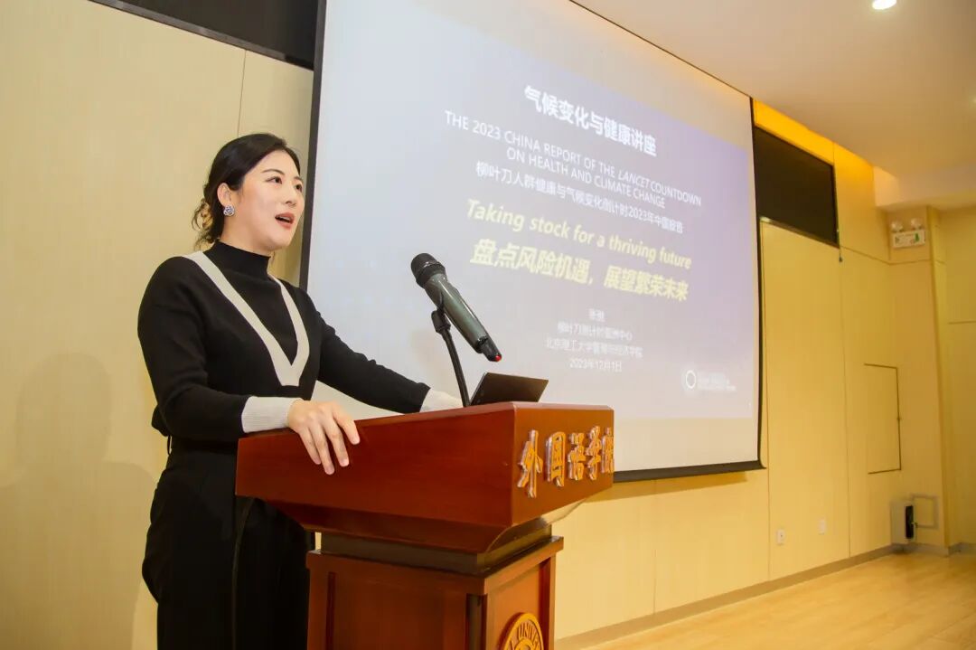 张弛教授首先以气候变化带来的威胁与物种消失话题与同学们进行了互动,强调了气候变化带来的严重影响。在解读2023年度《柳叶刀人群健康与气候变化倒计时报告》的核心观点中,张弛教授从气候变化带来的极端气象,到低碳转型中的关键领域,再到热射病等健康威胁带给人类的影响等方面展开。她指出,大部分全球热相关受害群体位于亚洲,影响方式包括极端气候事件、空气污染及能源结构损失等,亚洲是全球应对气候变化健康挑战的决定性区域,中国更是其中举足轻重的角色。
