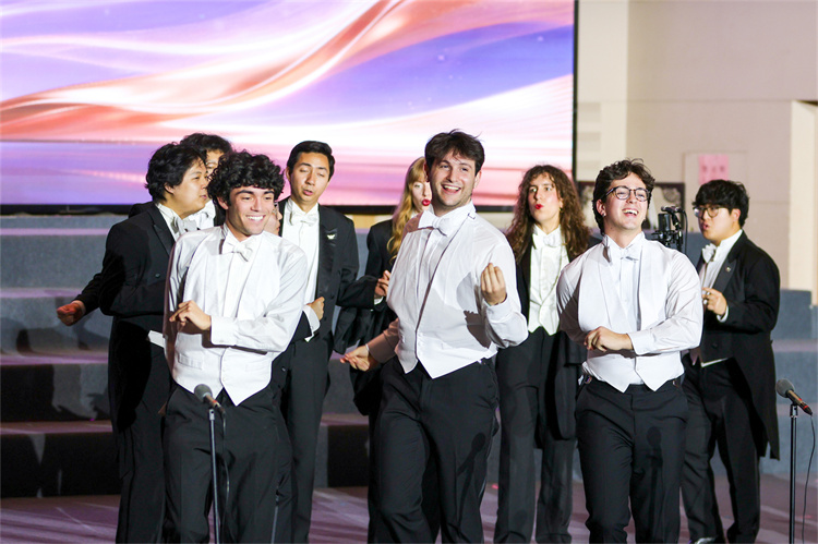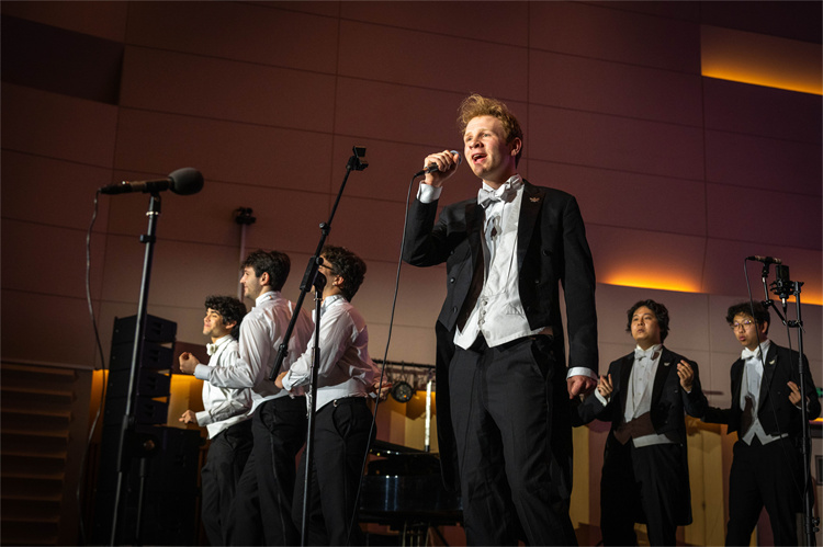 耶鲁大学Whiffenpoofs合唱团接续献上《自然男孩》(Nature Boy)《莎莉花园》(Down By The Salley Gardens)《月舞》(Moondance)等作品,身体随节奏自然律动,举手投足间尽显对音乐的痴迷。当他们用中文演唱《夜空中最亮的星》,现场气氛再次推向高潮。观众们点亮手机,随着旋律的起伏挥动。