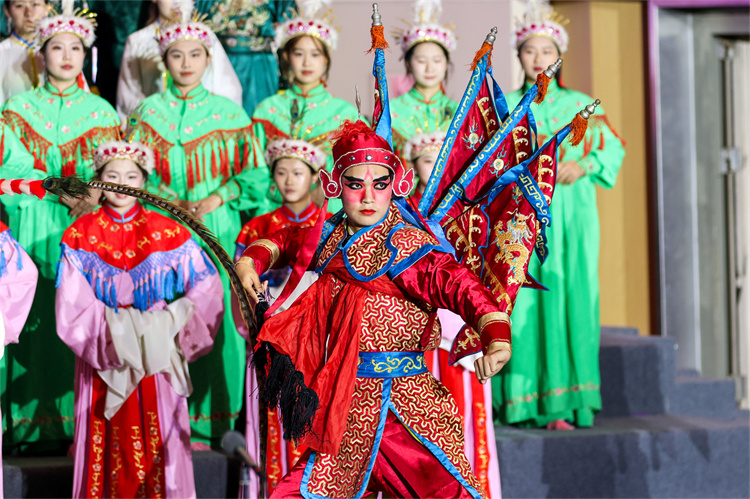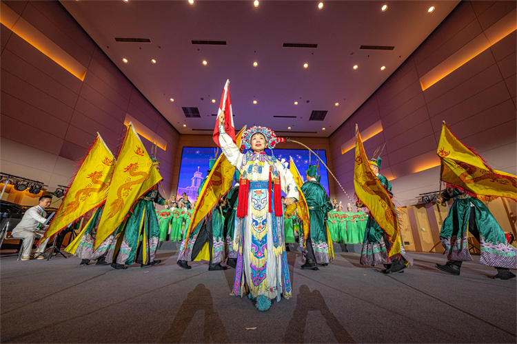 演出以南开大学学生合唱团有表演民谣合唱《盛世梨园情》开场。锣鼓声起,常任指挥孟超美教授以刀马旦装扮飒爽亮相,合唱团成员扮相灵动,和声悠扬。一方舞台上,生旦净丑各展风姿,唱念做打皆具神韵,梨园雅韵与现代合唱交织融合,赢得观众阵阵热烈掌声,让正在候场的耶鲁大学Whiffenpoofs合唱团由衷赞叹。